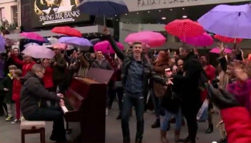 Here’s a little fun for a Sunday afternoon, to celebrate the UK release of the Disney movie Saving Mr. Banks, fans gathered at the spot where Mary Poppins first opened almost 50 years ago in London’s Leicester Square, for an rousing rendition of “Let’s Go Fly A Kite.”