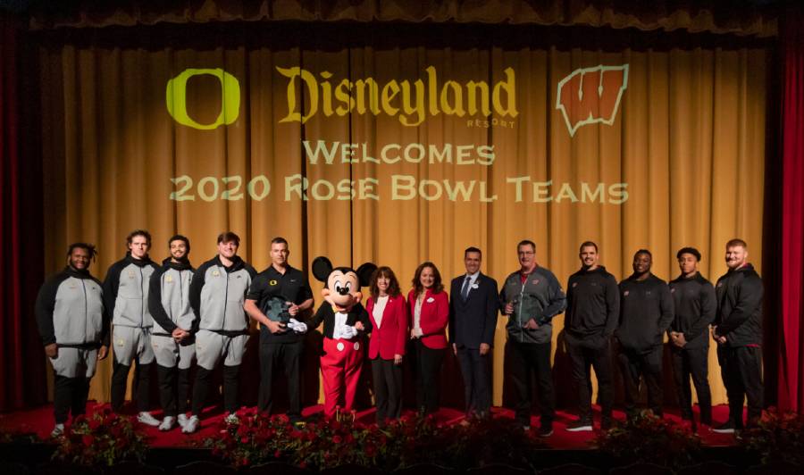 At the press conference was Oregon head coach Mario Cristobal along with Oregon leading players: linebacker Troy Dye, quarterback Justin Herbert, defensive tackle Jordan Scott and offensive lineman Calvin Throckmorton. Also present was Wisconsin head coach Paul Chryst along with Wisconsin leading players: running back Jonathan Taylor, linebacker Chris Orr, center Tyler Biadasz, and linebacker Zack Baun. The team members were welcomed by none other than Mickey Mouse, plus Tournament of Roses President Laura Farber, Disneyland Vice President, Kris Theiler, and Disneyland Resort Ambassador Rafa Barron.