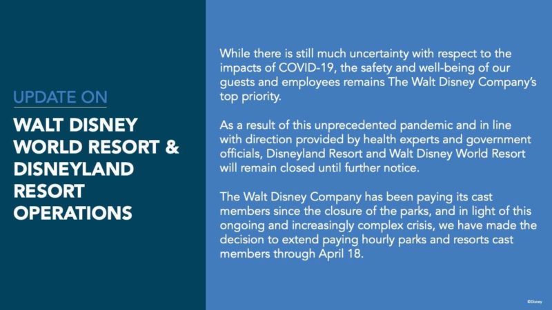 At Walt Disney World, while the Florida Governor has been slow to act, both Orange County and Osceola County have announced stay at home orders until at least April 9. That means any non-essential cast members won’t be able to report for duty until at least that date.
