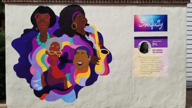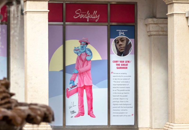 The emerging Black artists began by collaborating with Pixar artists, then were given creative license to interpret “Soul” any way they want to. The result is a vibrant street art display. Each artwork has a bio of the artist.