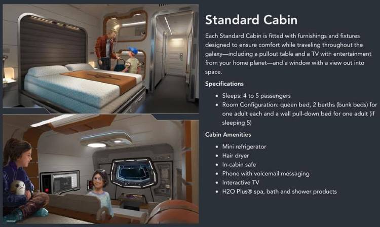 Stays are billed as an immersive experience. Guests will arrive at the Star Wars: Galactic Starcruiser Terminal (above) and stay onboard the magnificent Halcyon starcruiser, in a cabin or suite, with a “view of space.”