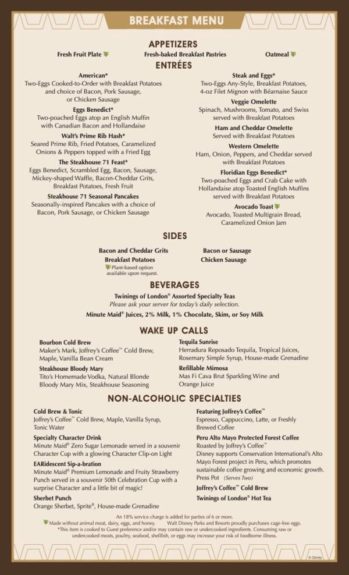 The menus offer a nod to Walt Disney himself. Choose from dishes inspired by some of Walt’s favorites, including Walt’s Prime Rib Hash for breakfast and French Onion Soup, Prime Rib, 6-oz Filet Mignon, or Dry-aged Bone-In Pork Chop for lunch or dinner.