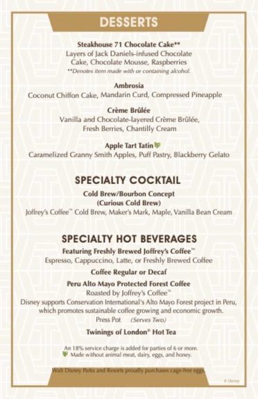 A highlight is the namesake Steakhouse 71 Chocolate Cake, which features 15 layers of whiskey-infused chocolate cake, chocolate mousse, and raspberries – one layer for every floor at Disney’s Contemporary Resort.