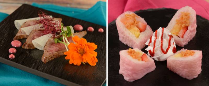 - Frushi: Strawberry, pineapple, and cantaloupe wrapped in sweet rice and pink soy wrap served with whipped cream, berry sauce, and toasted coconut