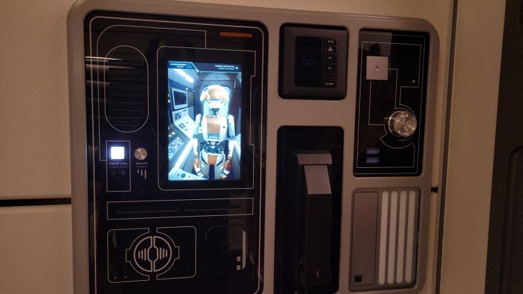 Halcyon passengers activate the D3-09 Logistics Droid from inside their cabin by pressing the “Droid Link” button on the room’s control panel. They’ll then be connected via video to D3-09 a droid with a unique perspective on the Halcyon.