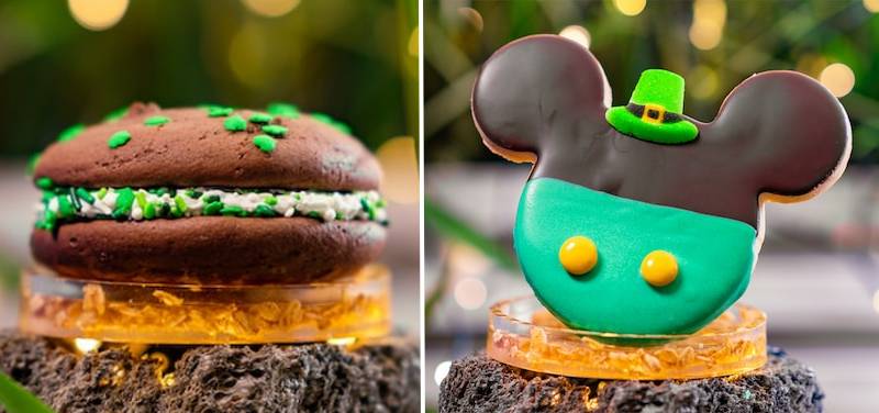 - Mickey-shaped Leprechaun Cookie: Vanilla sugar cookie dipped in dark chocolate and decorated with rolled fondant (New)