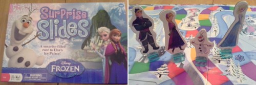 Our overall favorite Disney Frozen Surprise Slides. This game is similar to the classic game Candy Land, but with the twist that you can pop out pieces on the board and change the game track. It adds an extra level of strategy to the game, but it’s easy to knock over game pieces doing this. Our 6 year old and 9 year old testers loved this game, and it was fun for the adults, too. Much laughter was had during the game. This game is for 2-4 players; Ages 3+ (beware of small pieces).