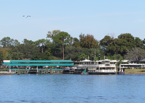 However, when you’re arriving via ferry boat, this is an even worse sight — a ferry still in the dock. We didn’t have to wait as long this week as we did last week (about 6 minutes of waiting this time, about 12 minutes last week). But even more frustrating was the fact that both monorail lines came back to life while we were stuck in the middle of the lake and started delivering guests from TTC to the main entrance ahead of us.