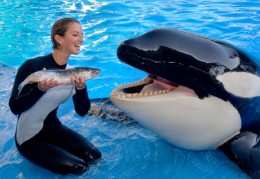Animal trainer Amber Cavett offers a piece of sustainable salmon for Shamu at SeaWorld Orlando.